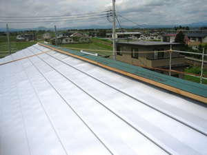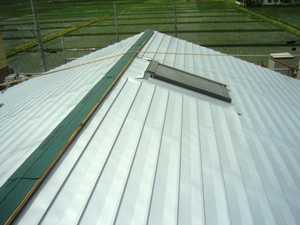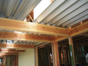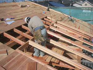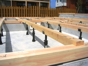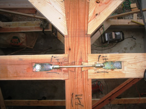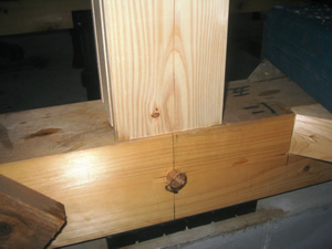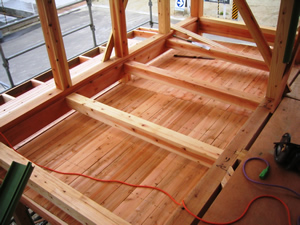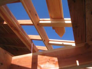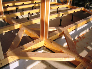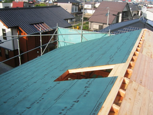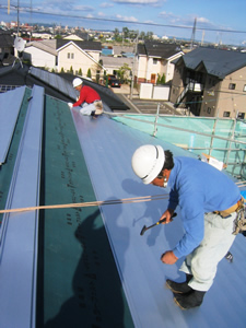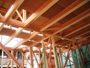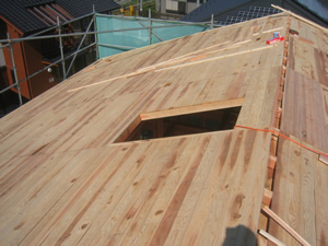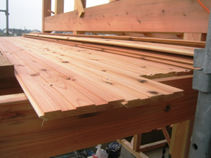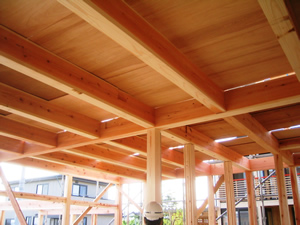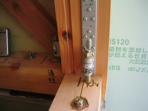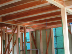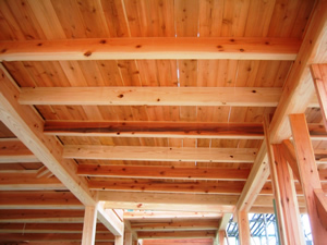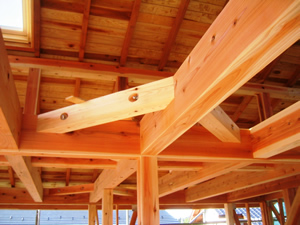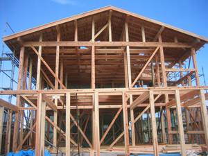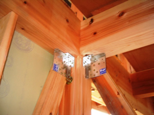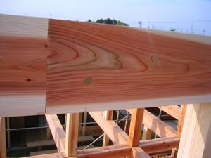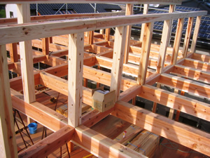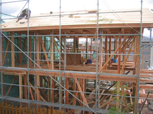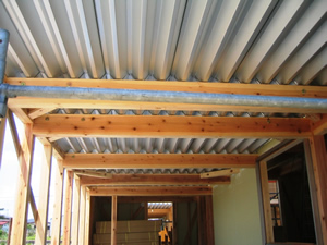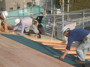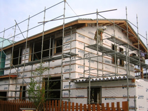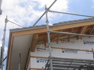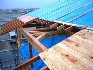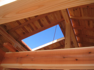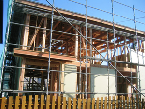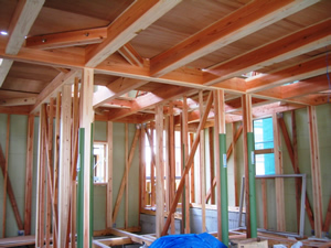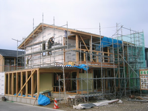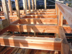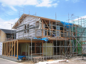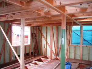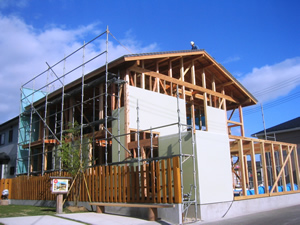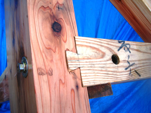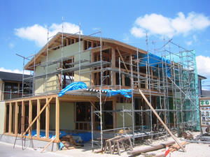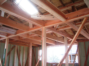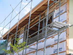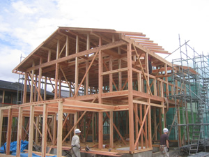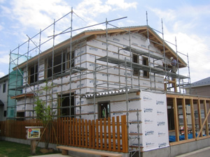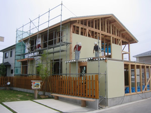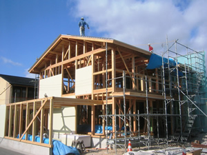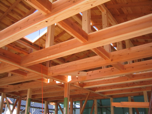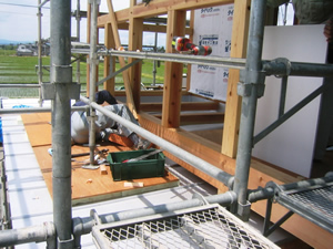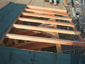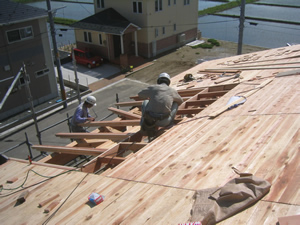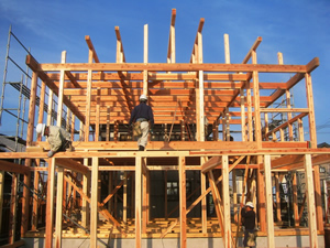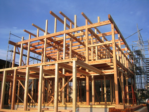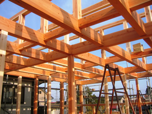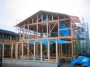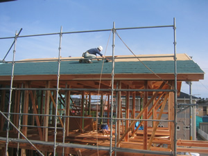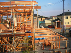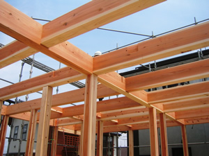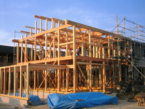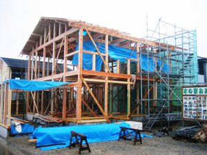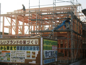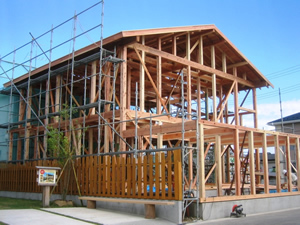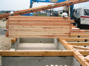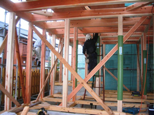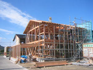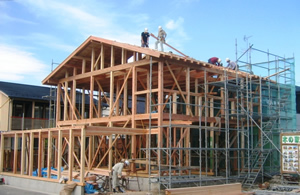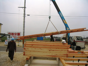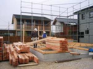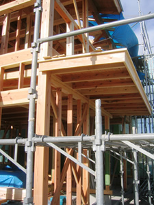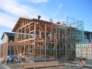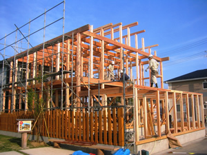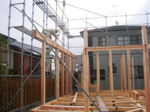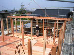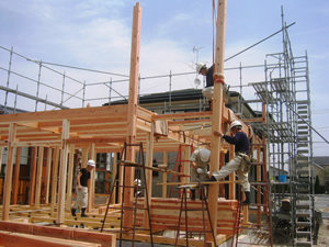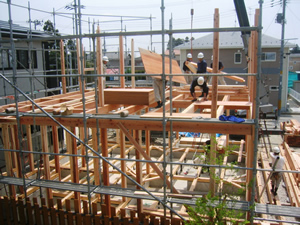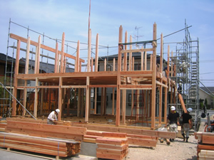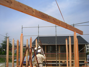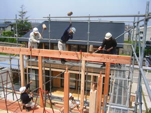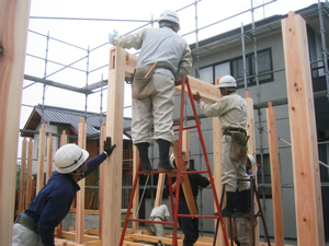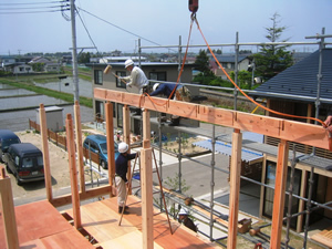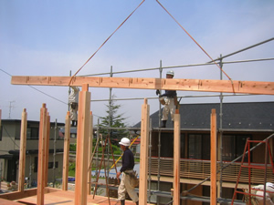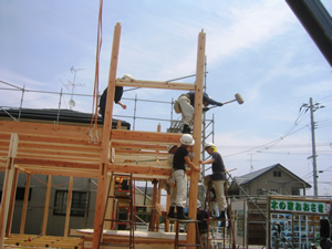 | ■平成18年5月18日(木) 快晴 威勢の良い掛け声とともに、確かな技術で柱が組み立てられていきます。 |