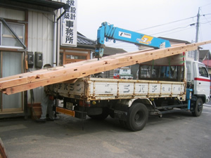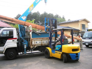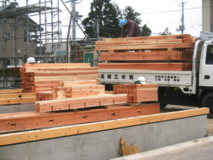 | ■平成18年5月17日(水) 快晴 木材を搬出しました。いよいよ明日は棟上げです。 |